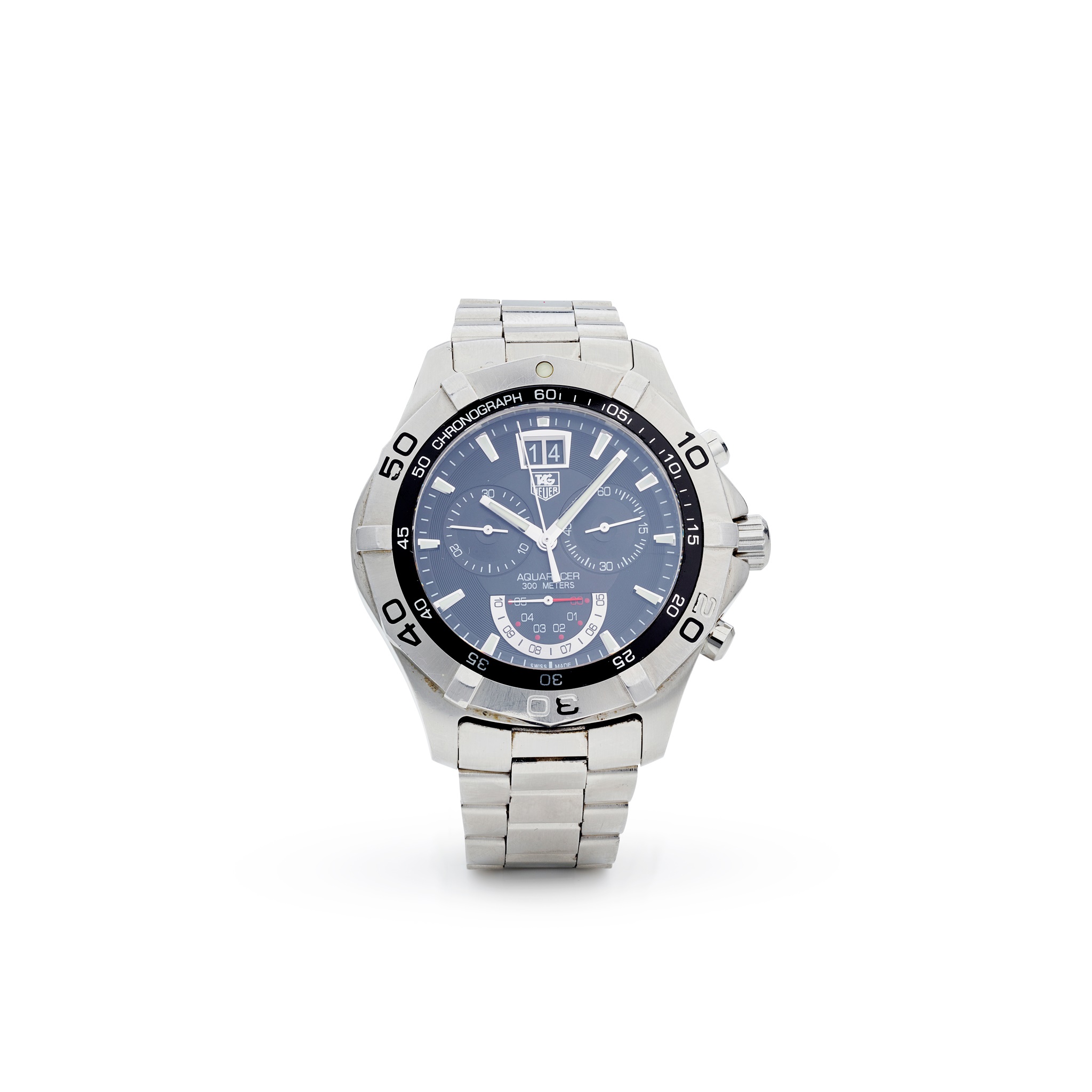 Aquaracer 300 meters Grande Date model CAF101A, stainless steel case, quartz movement, originally purchased 2010 from guarantee card, round black dial with applied stainless steel wedge hour markers, subsidiary dials at 3 and 9 for small seconds and 30 minute register respectively, demi-lune subsidiary dial at 6, date aperture at 12, outer seconds track in white, stainless steel bezel with ceramic insert with seconds track with Arabic numerals, further larger Arabic numerals to the outer steel section, with CAF101A to the caseback, on a stainless steel bracelet strap with signed TAG Heuer foldover clasp, with additional links, in box, with booklets and guarantee card, with original receipt
