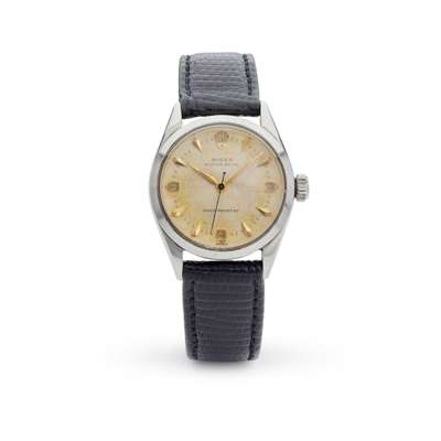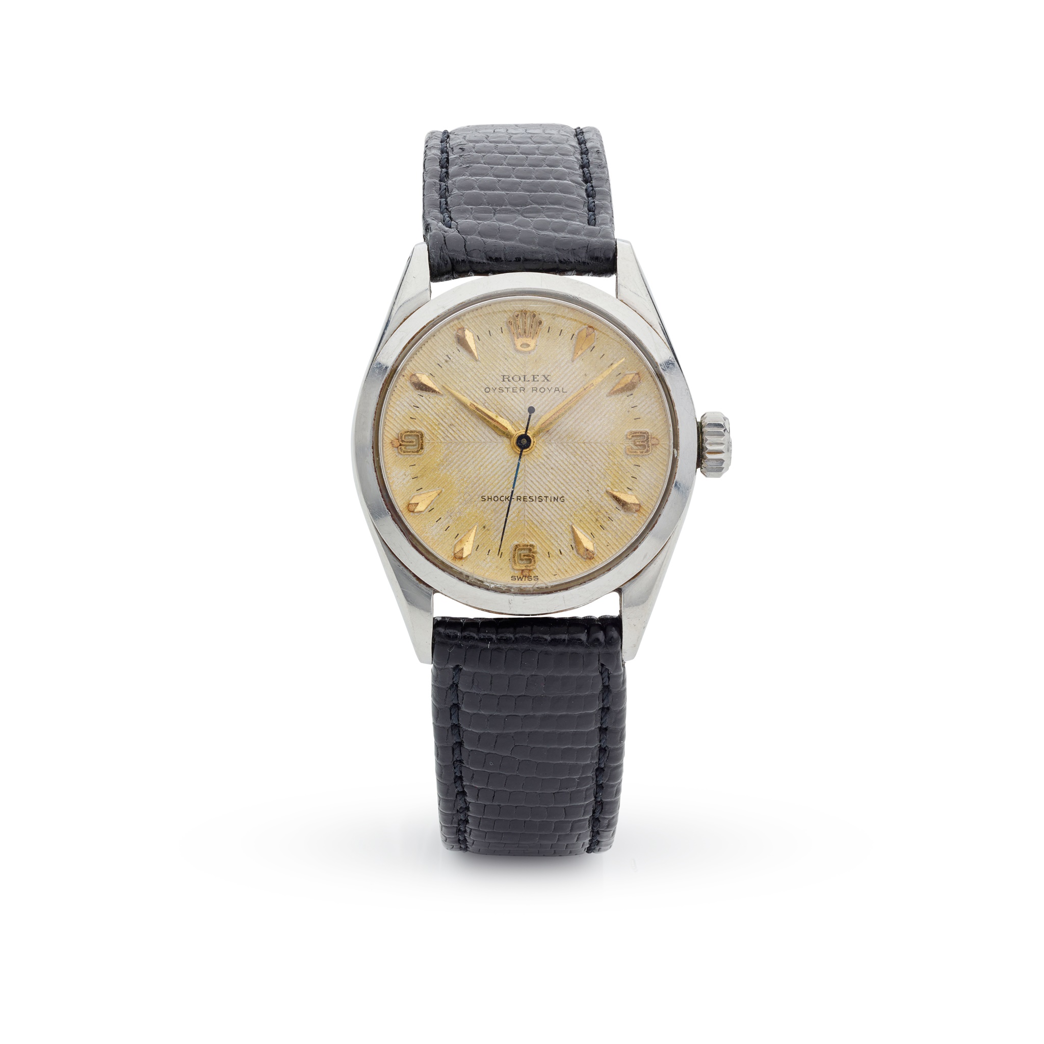 Oyster Royal model 6246, stainless steel case, signed Rolex manual wind movement numbered 41604, 1957 from serial number between lugs, signed round dial with applied gold-coloured coronet at 12, Arabic 3, 6 and 9 and bevelled arrowhead hour markers, outer seconds track, gold-coloured dauhpine hands with lume inserts, centre seconds hand in black, screw-down crown with coronet, on a modern lizard strap, no box and papers