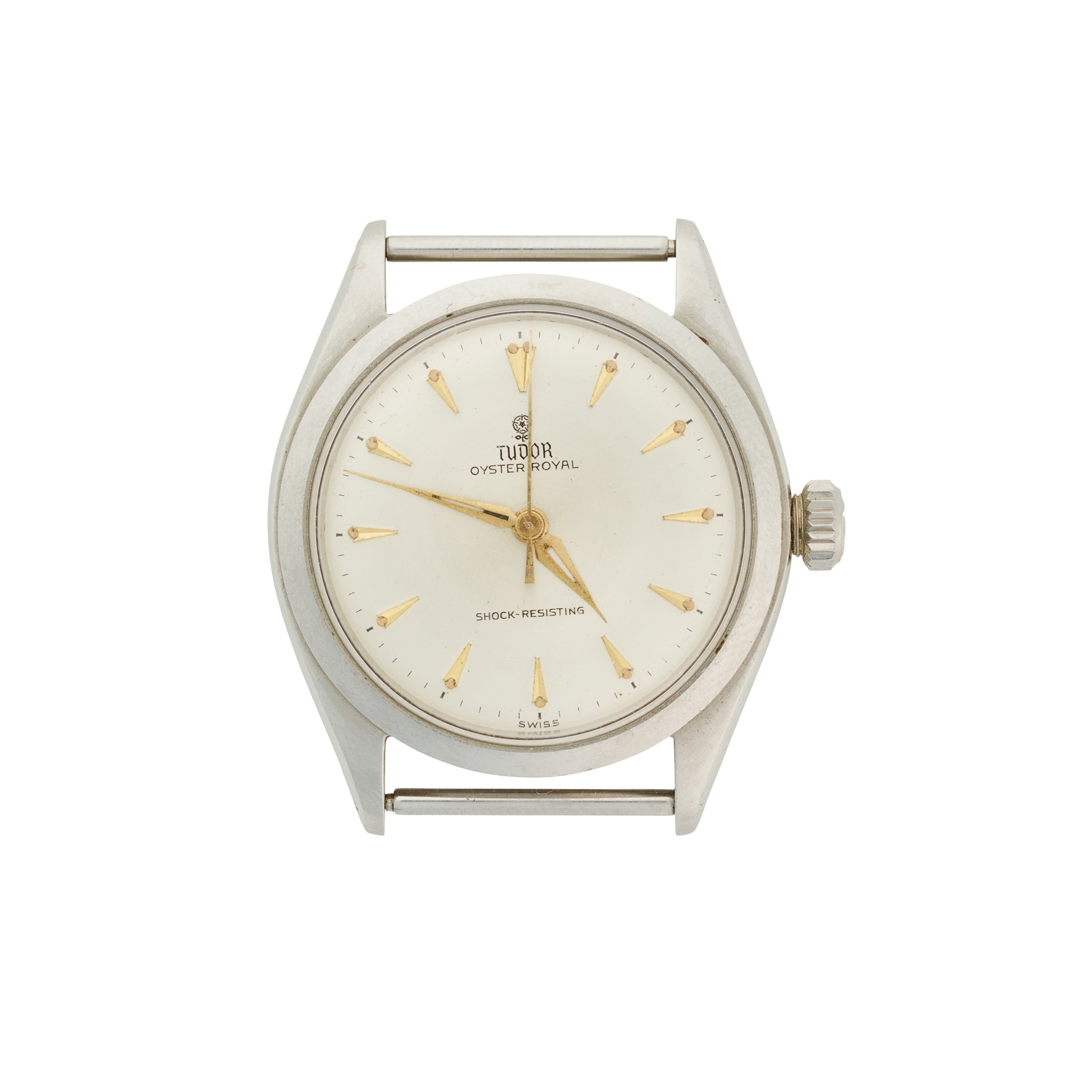 Oyster Royal model 7934, stainless steel case, manual wind movement, round silver-coloured dial with applied gold-coloured arrowhead hour markers, gold-coloured sword hands, centre seconds hand, screw-down crown with coronet, caseback with ORIGINAL OYSTER CASE BY ROLEX GENEVA, no strap, in box, no papers