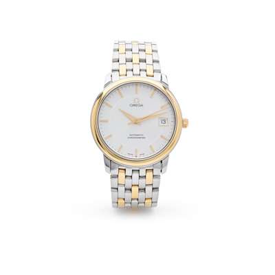 Automatic Chronometer model, stainless steel case, signed Omega automatic movement numbered 60315217, signed round silver-coloured dial with applied gold baton hour markers, date aperture at 3, gold sword hands, outer seconds track in black, centre seconds hand also in gold, gold-coloured bezel, on an integrated bi-colour bracelet strap with signed Omega clasp numbered 1505/835, no box and papers