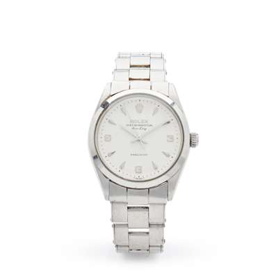 Oyster Perpetual Air-King model 5500, stainless steel case, automatic movement, 1966 from serial number, round white dial with applied stainless steel Arabic numerals and arrowhead hour markers, stainless steel pencil hands, centre seconds hand, outer seconds track, screw-down with coronet, on a tapered stainless steel stretch Oyster bracelet strap with 57 to the end link and 6635 to the first link, with signed Rolex foldover clasp, no box and papers