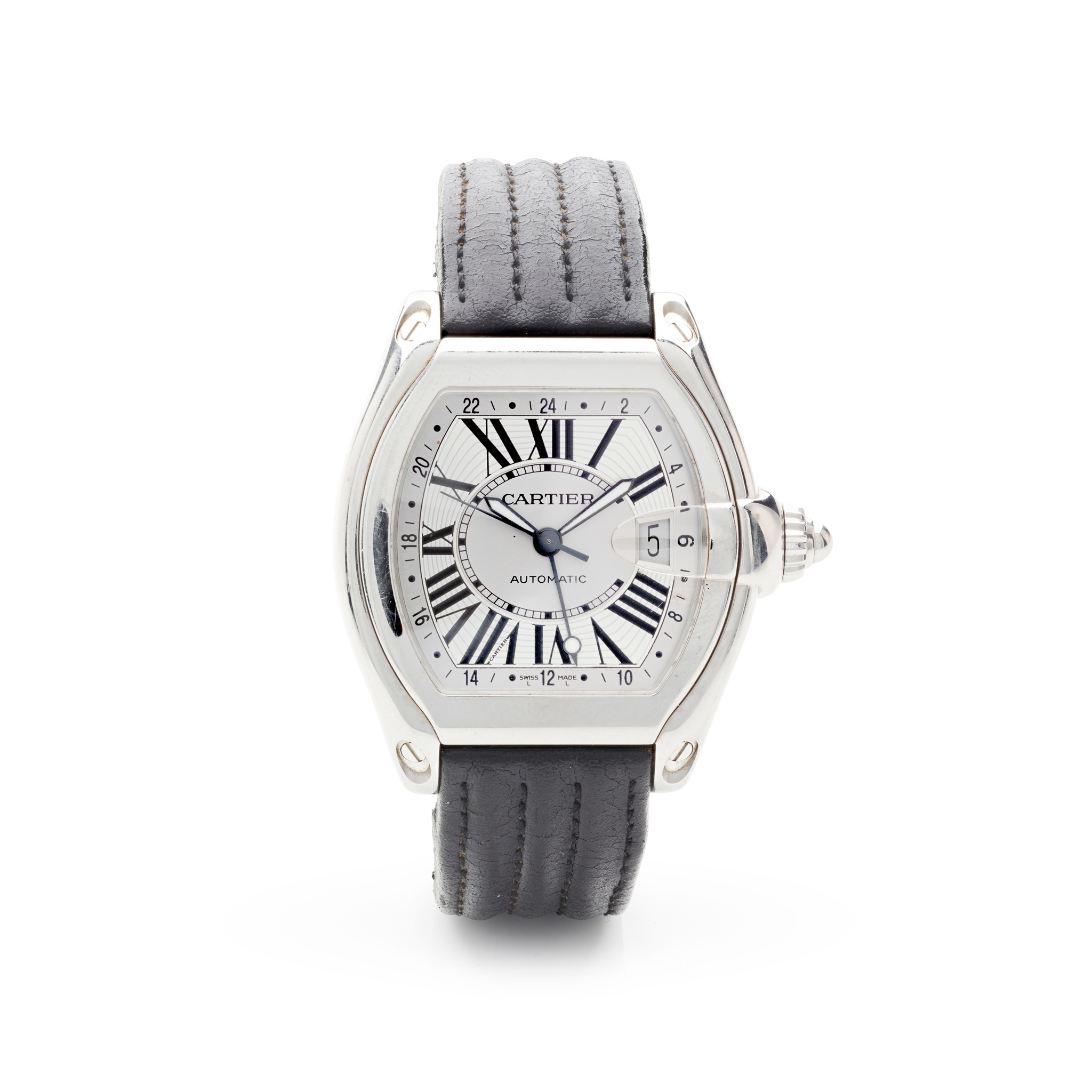 Roadster model 2722, stainless steel case, automatic movement, tonneau-shaped silver-coloured dial with Roman numerals in black, date aperture at 3, inner railroad seconds track also in black, outer 24 hour scale, on a signed Cartier black leather strap with signed stainless steel deployant clasp, with additional signed Cartier stainless steel bracelet strap, no box and papers