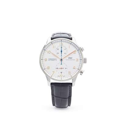 Chronograph Automatic model, stainless steel case, automatic movement, round white dial with applied gold-coloured Arabic numerals, sunken 30 minute register at 12, small sunken seconds at 6, outer seconds track, raised outer seconds track with Arabic numerals, signed crown flanked by twin cylindrical push-buttons, on a black leather strap with signed IWC clasp, no box and papers