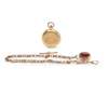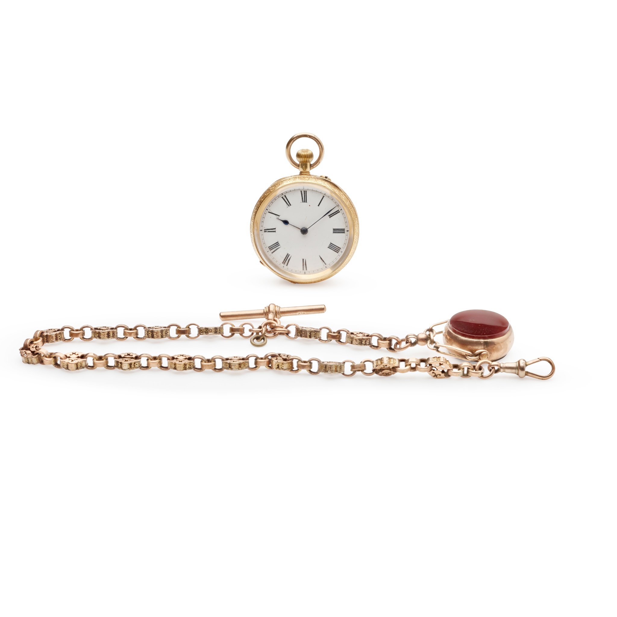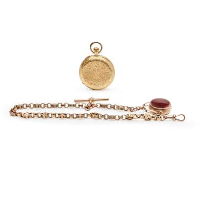open face, keyless wind, the case marked 18K, 3/4 plate movement, round white enamel dial with Roman numerals in black, outer seconds track in black, blued steel leaf hands, decorative engraving to the caseback, along with a chain formed by fancy links, unmarked but with 375 to the T-bar