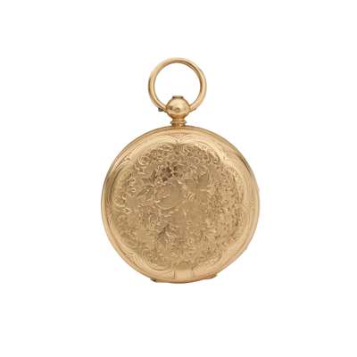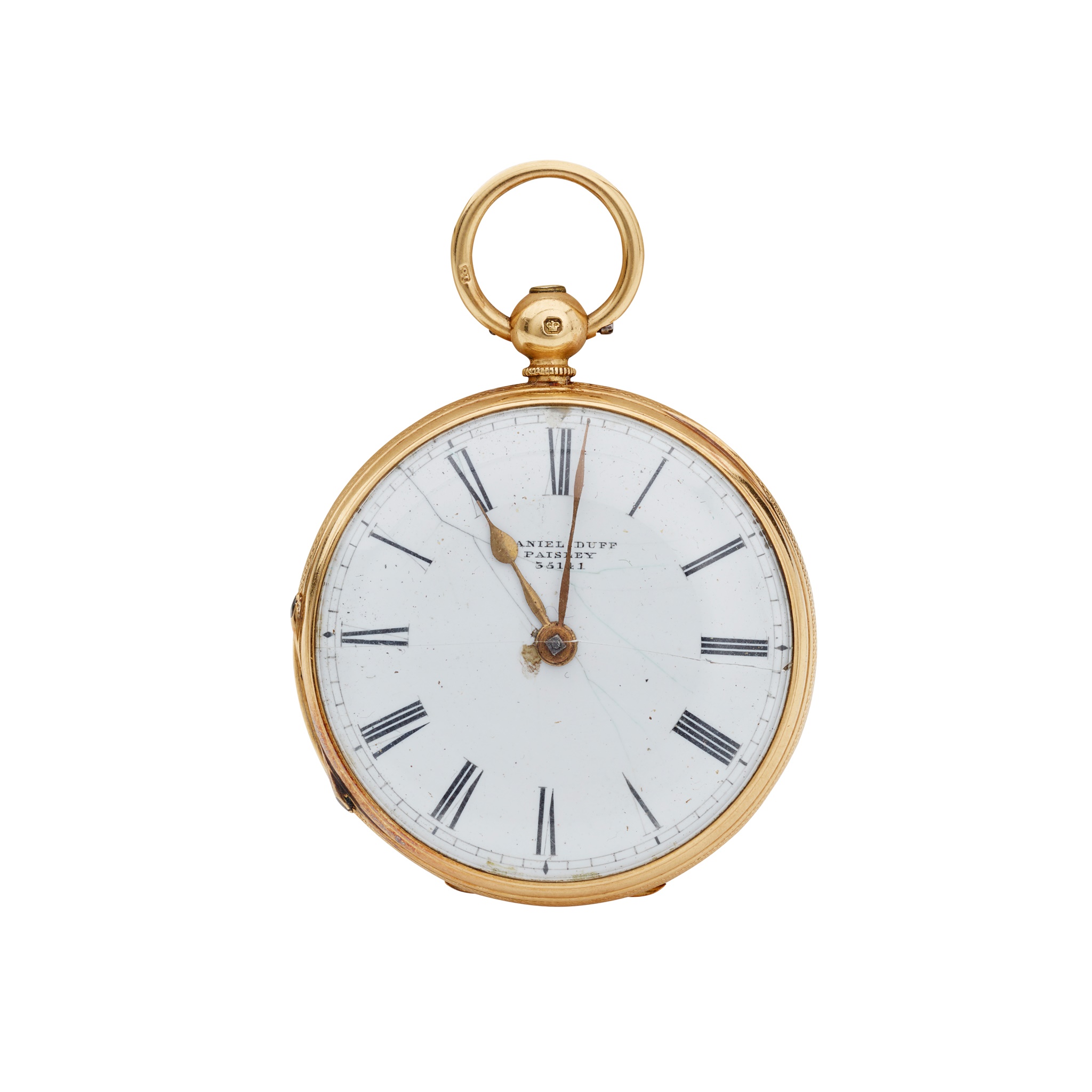 open face, key wind, the movement signed David Duff, Paisley, round white enamel dial with Roman numerals in black, railroad outer seconds track in black, gold-coloured leaf hands, the caseback with decorative engraving, with full London hallmarks to the interior