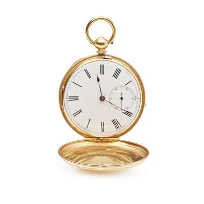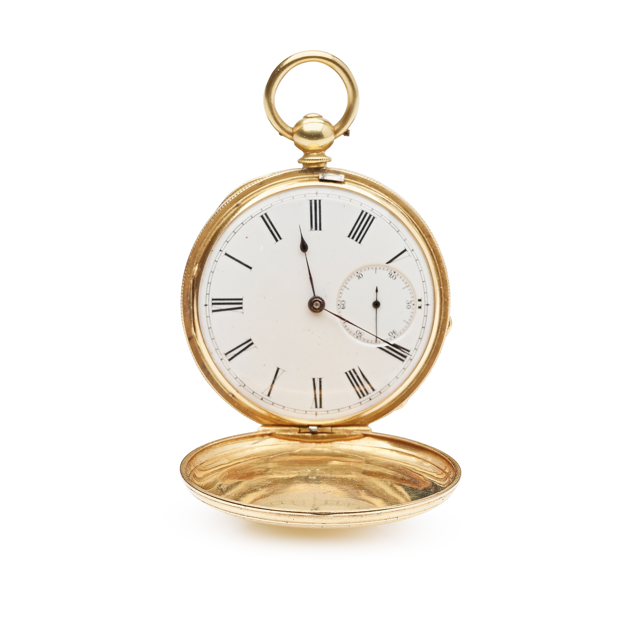 full hunter, key wind, round white enamel dial with Roman numerals in black, movement signed STAUFFER, CX DE FONDS, sunken small seconds at 6, railroad outer seconds track in black, blued steel leaf hands, the case interior marked 18, machined engraving to the casefront and back
