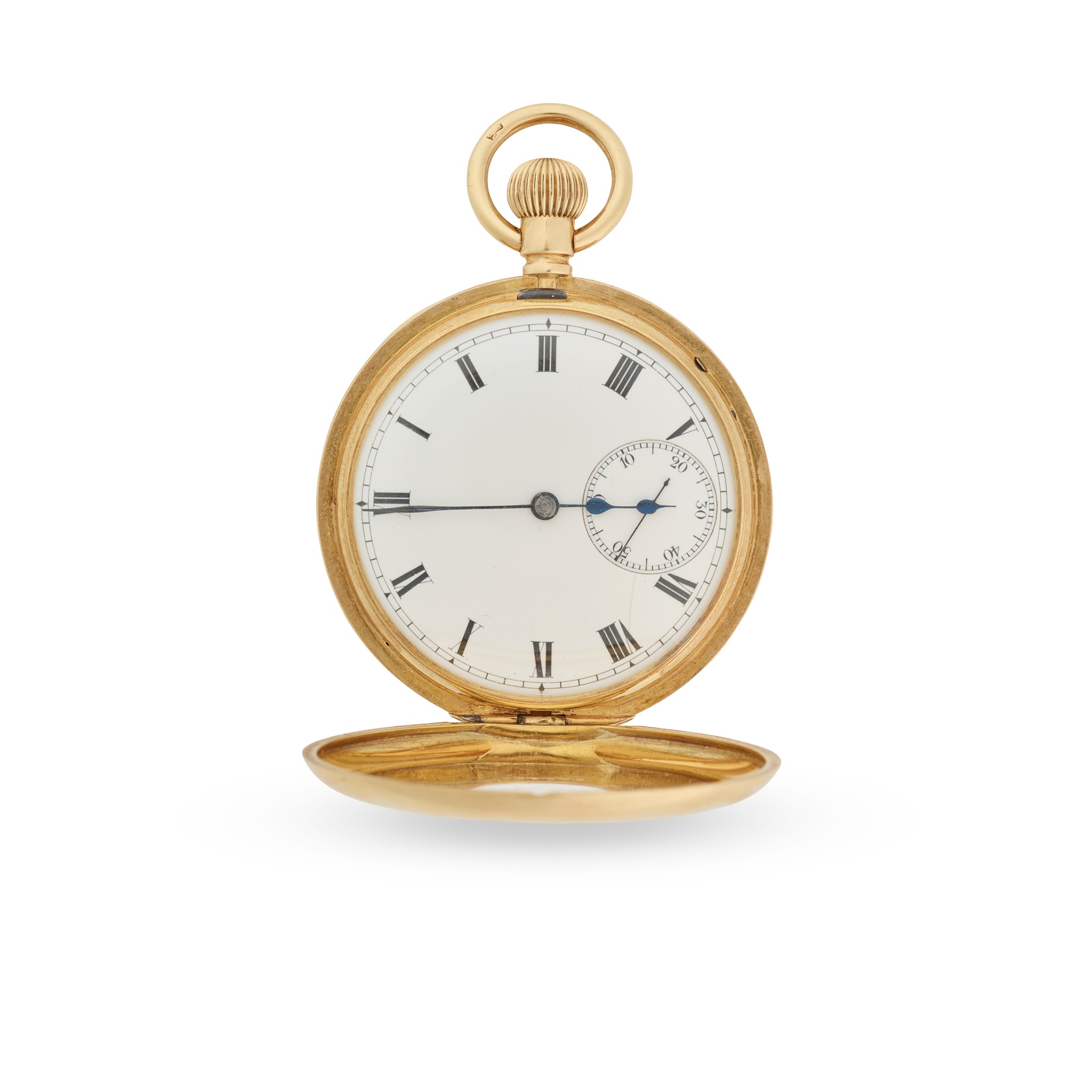 half hunter, keyless wind, 18ct gold case, unsigned 3/4 plate movement, round white enamel dial with Roman numerals in black, sunken small seconds at 6, railroad outer seconds track in black, blued steel leaf hands, case front with Roman numerals in enamel around the viewing aperture, the caseback with engraved initials and crest