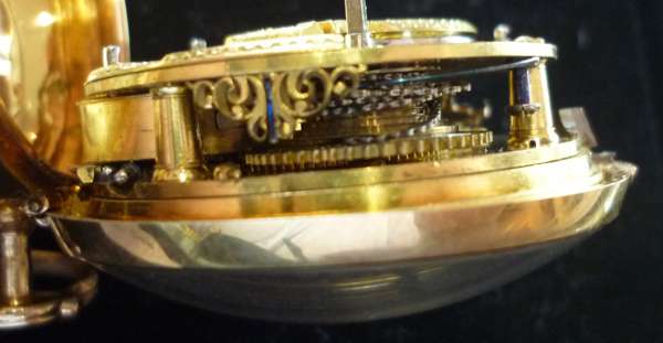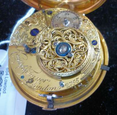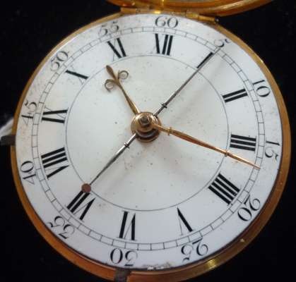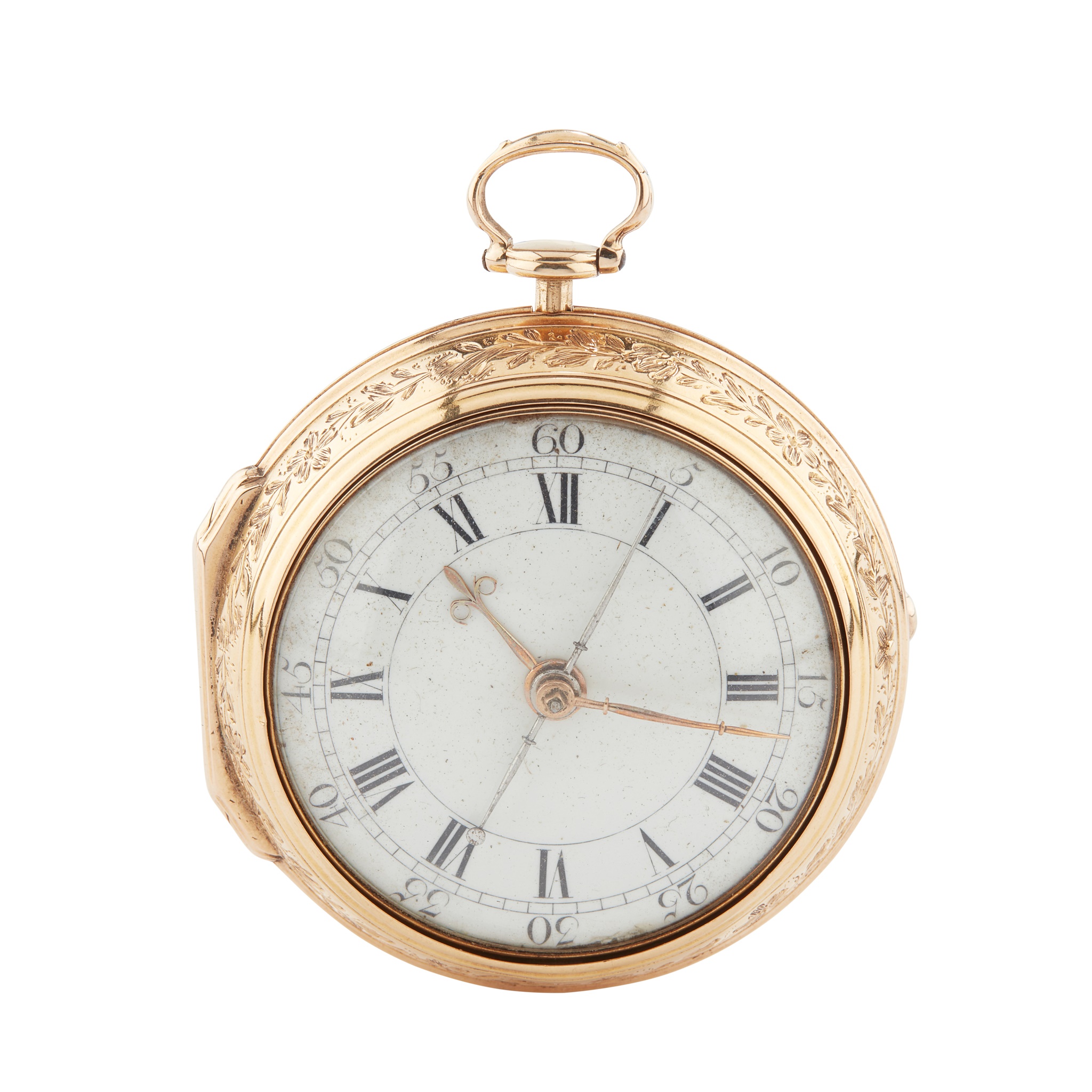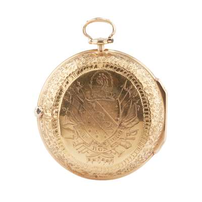the outer case interior with partial London hallmarks, the movement cover signed movement Kentish & Turner 2755, round white enamel dial with Roman numerals in black, railroad outer seconds track in black with Arabic numerals, ornate hands, the outer case with coat of arms to the back and engraved all over, marked HB to the interior, in an outer shagreen case