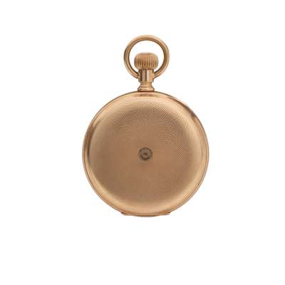 full hunter, keyless wind, marked 14K to the case interior, signed Waltham movement, round white enamel dial with Roman numerals in black, sunken small seconds at six, railroad outer seconds track in black, with personalised inscription to the movement cover, numbered 6279420, monogram within belt motif to case exterior