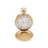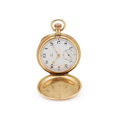 full hunter, keyless wind, case marked 18k, signed Omega 3/4 plate movement numbered 6424060, round white enamel dial with Arabic numerals in black, small seconds at 6, railroad outer seconds track in black, gold leaf hands, the casefront interior marked 6496556