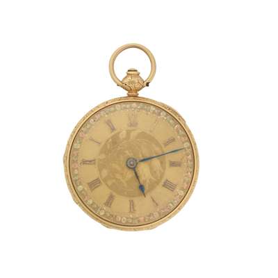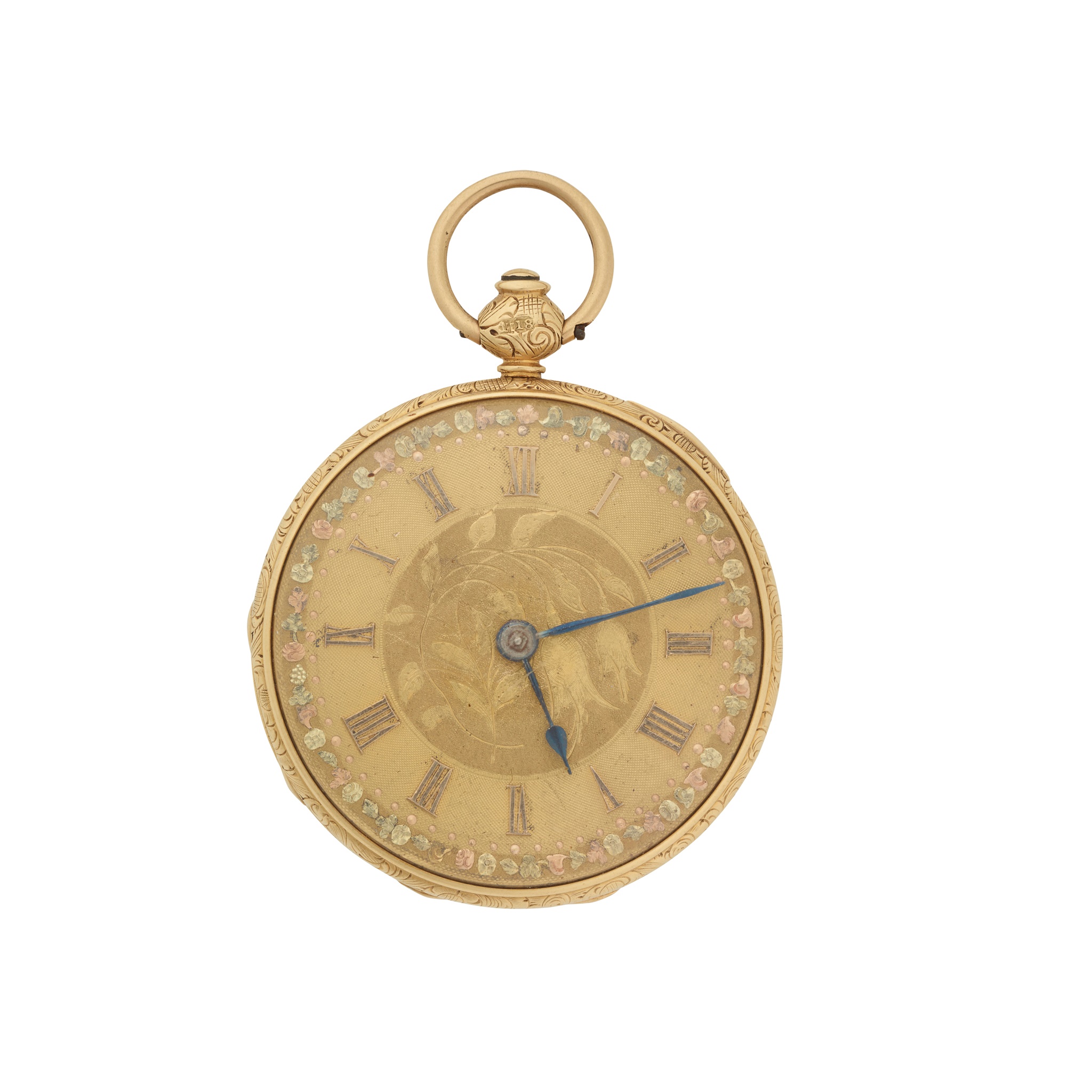 open face, key wind, 18ct gold case, full plate movement signed HM Lachlan, round gold-coloured dial with central section of decorative engraving, Roman numerals in relief, blued steel leaf hands, outer rose and yellow gold motifs, decorative engraving to case edge and caseback