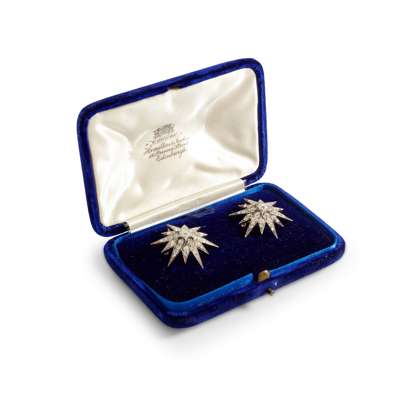 each of traditional design, set throughout with graduated old round-cut diamonds, unmarked; in a fitted case for Hamilton & Inches, 88 Princess Street, Edinburgh