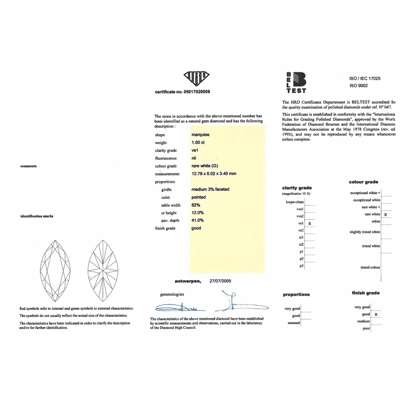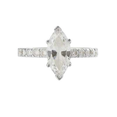 claw-set with a marquise-cut diamond, each shoulder set with five round brilliant-cut diamonds, stamped 750; with accompanying HRD report, dated 27.07.05, numbered 05017020008, stating that the diamond is 1.50cts, VS1 clarity and G colour, showing no fluorescence