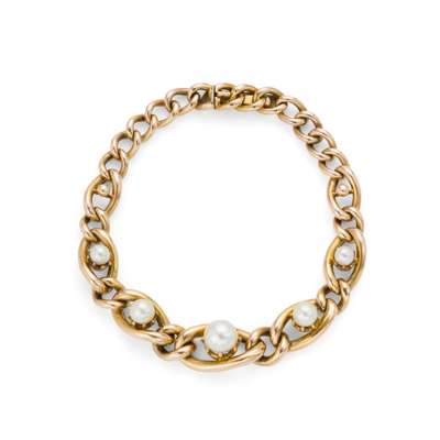 composed of graduated curb-links claw-set with five graduated (untested) pearls, stamped 15ct