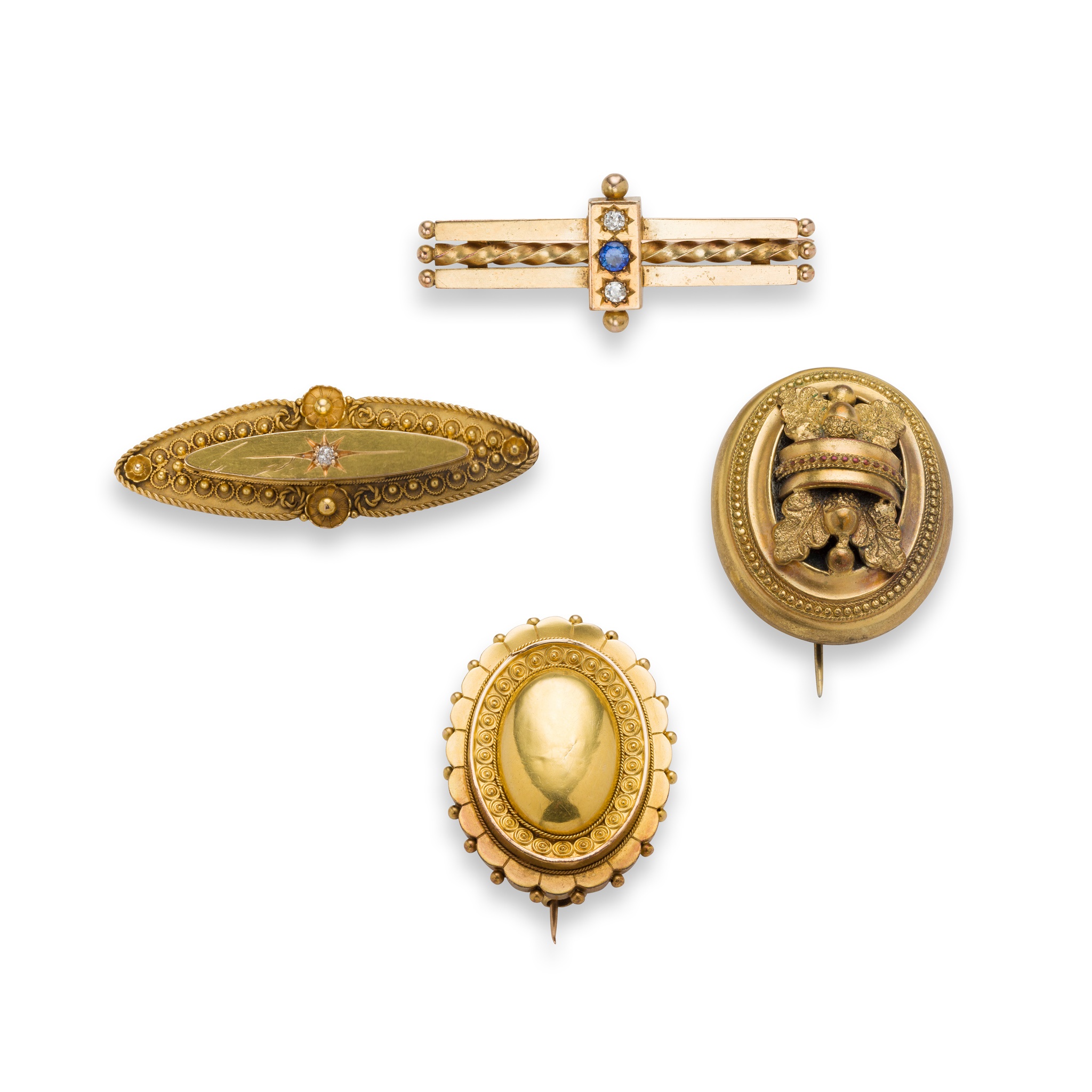 including a 15ct gold sapphire and diamond bar brooch, a 15ct gold diamond brooch; an unmarked oval brooch and an oval pinchbeck brooch with acorn detail