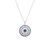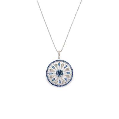 of pierced circular design, set throughout with graduated round-cut sapphires and diamonds, stamped 14k; to a trace-link chain, unmarked