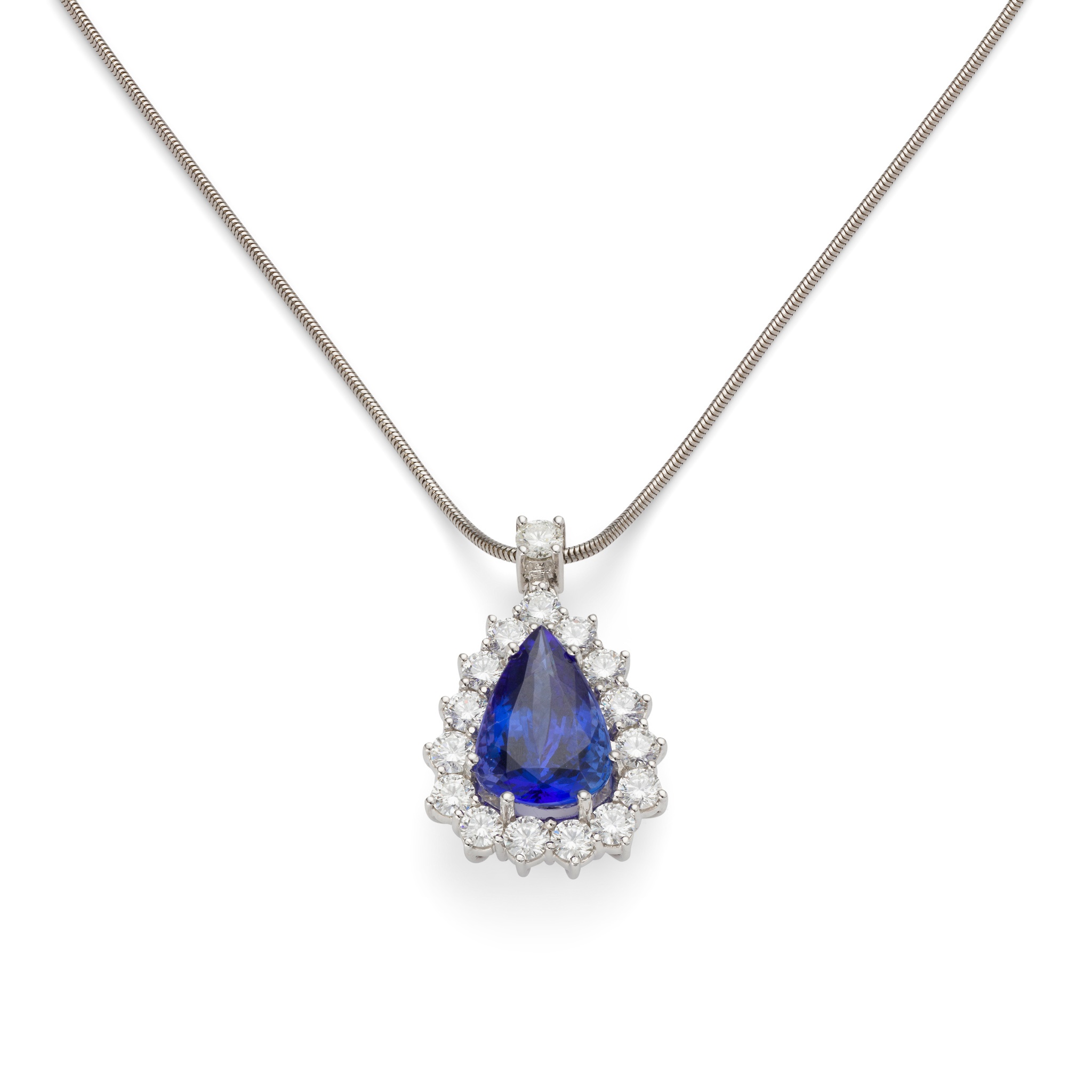 claw-set with a pear-shaped Tanzanite in a border of round brilliant-cut diamonds, mounted in 18ct white gold; to an unmarked snake-link chain