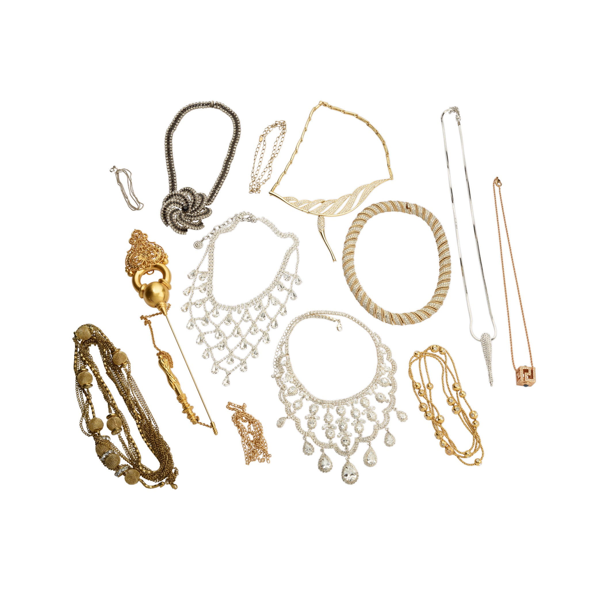 including two colourless crystal necklaces, one signed Grazano; various other paste-set necklaces and an over-sized gilt metal Indian-style jabot pin