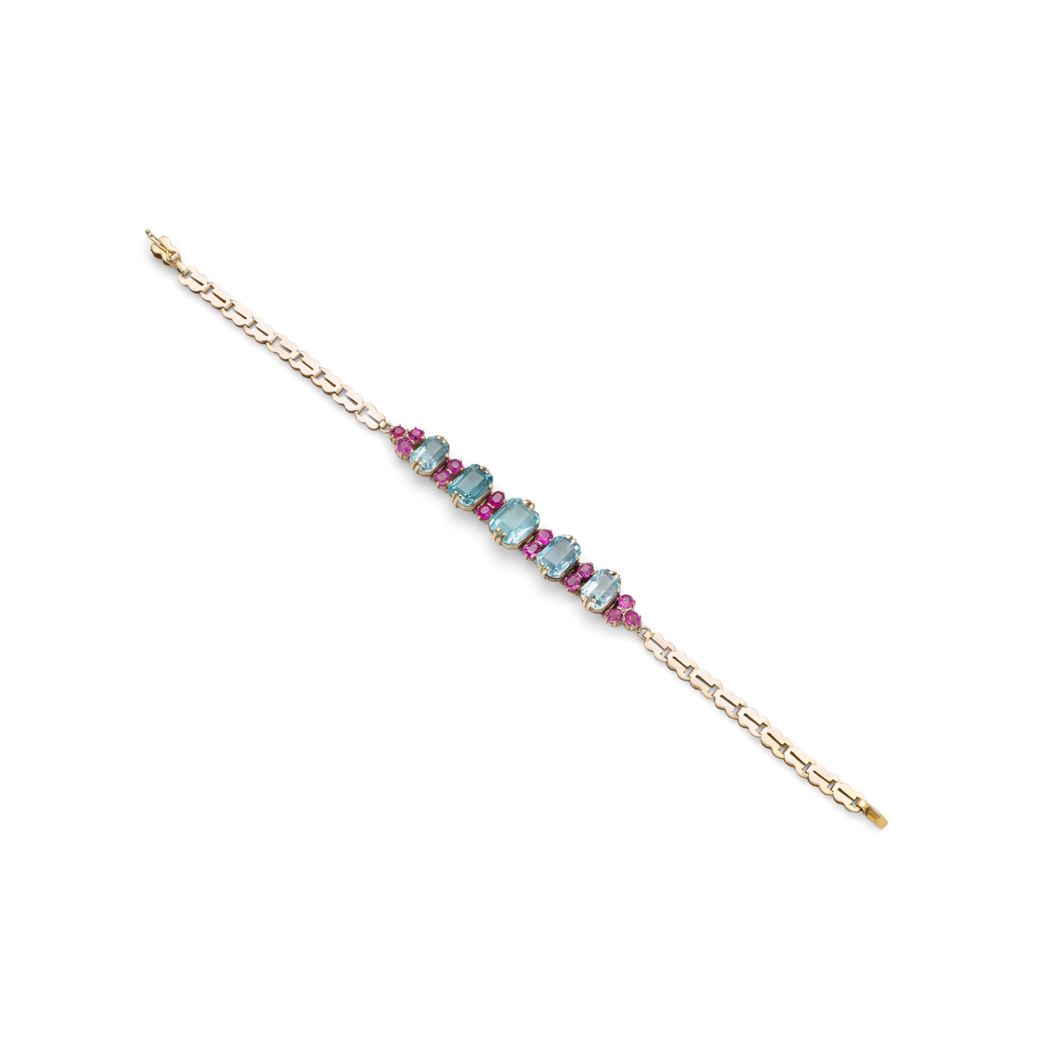claw-set with three cut-cornered rectangular-cut aquamarines, between pairs and clusters of cushion-cut pink sapphires, unmarked