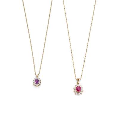 claw-set with an oval-cut ruby in a border of round brilliant-cut diamonds, modelled in 9ct gold, to an 18ct gold box-link chain; together with an amethyst and diamond pendant necklace, modelled in 9ct gold, to an unmarked trace-link chain