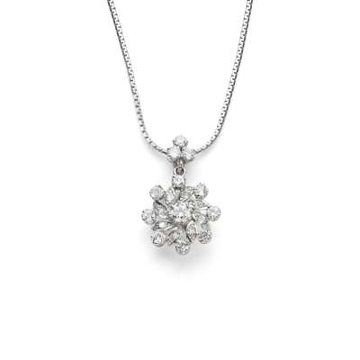 claw-set with a central old round-cut diamond, in a border of smaller old round and eight-cut diamonds, unmarked; to an 18ct gold woven trace-link chain