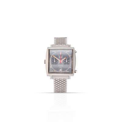 Monaco Automatic Chronograph model, 1970s, stainless steel case, manual wind movement, square dark grey-black dial with red hour markers, date aperture at 6, rounded square 30 minute register at 3 and 12 hour register at 9, outer seconds track in white, stainless steel hands with red inserts, red chronograph seconds hand, crown to the left hand-side of the case, twin push-buttons to the right, with Tool No. 033 to the caseback, on a stainless steel bracelet strap with signed Heuer clasp, no box and papers