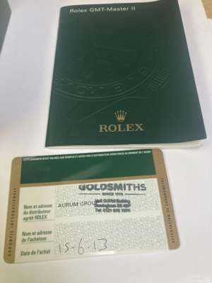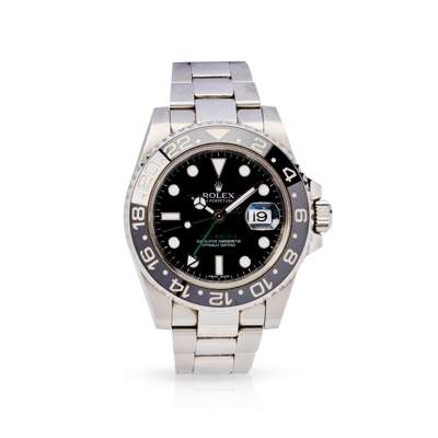 Oyster Perpetual Date GMT-Master model 116710, stainless steel case, signed Rolex calibre 3186 automatic movement, 2010 from serial number to rehaut, originally purchased 2013, round black dial with stainless steel-edged lume plots and baton hour markers, date aperture at 3, outer seconds track, lume-filled Mercedes hands, centre seconds hand with lume plot, green GMT hand with lume-filled pointer terminal, black ceramic bezel with 24 hour scale, screw-down crown with coronet, on a stainless steel Oyster bracelet strap with signed Rolex foldover clasp marked 7CT to the interior, in box, with guarantee card and booklet