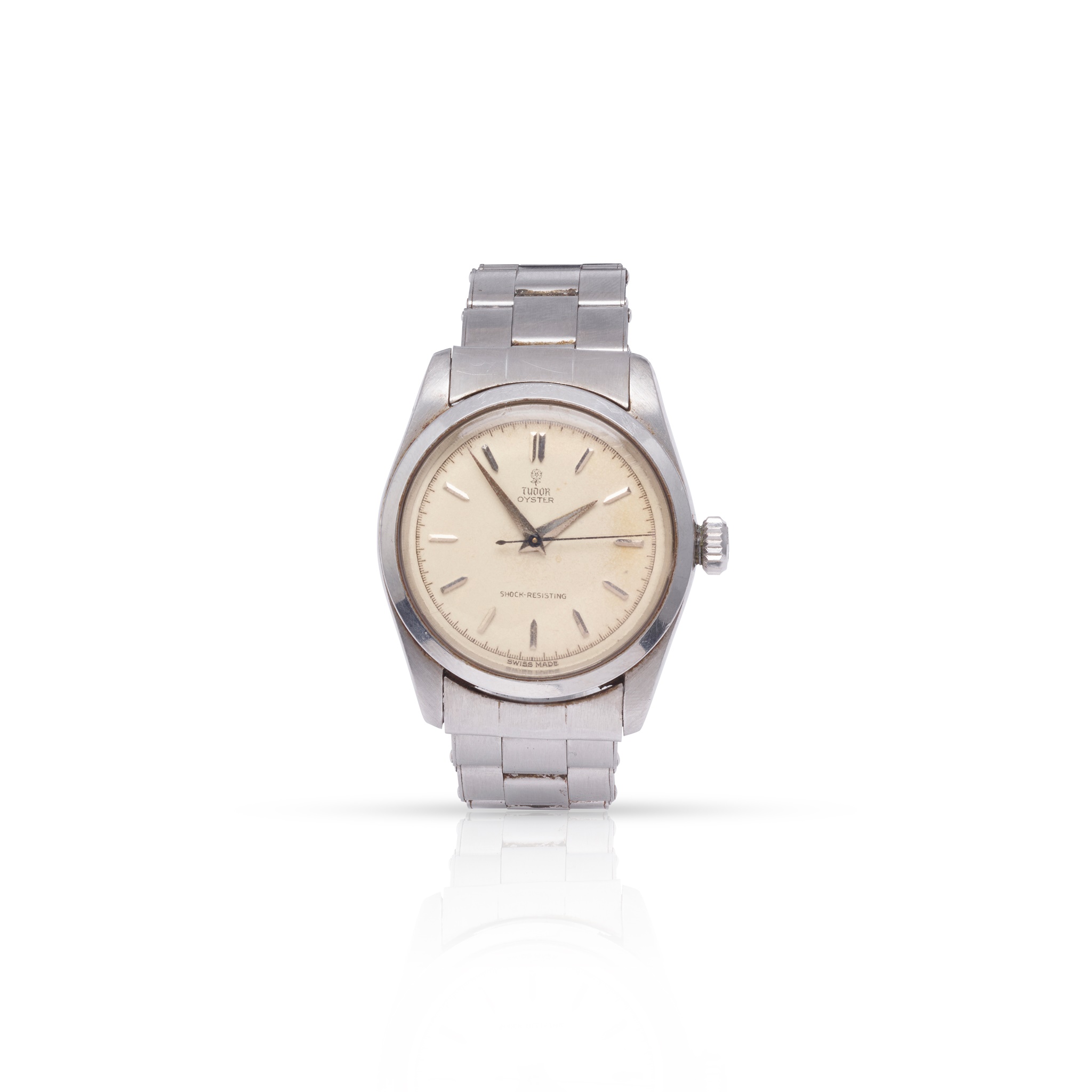 Oyster Shock-Resisting model 7904, c.1956, round white dial, applied steel hour markers, outer seconds track in black, bevelled stainless steel sword hands, centre seconds hand in black, screw-down crown with coronet, caseback with model and serial numbers, on a tapered hollow-link Oyster bracelet strap with 60 to the end links, with a signed Rolex foldover clasp, no box and papers