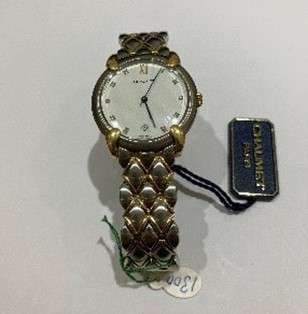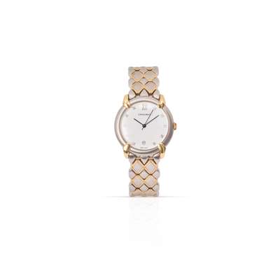stainless steel case, quartz movement, signed round white dial with applied diamond hour markers, date aperture at 6, the gold lugs reaching over the casefront, gold onion crown, the caseback numbered 207857, on a bi-colour stainless steel and gold bracelet strap with signed concealed clasp, in box, with warranty card (blank), with swing tag