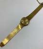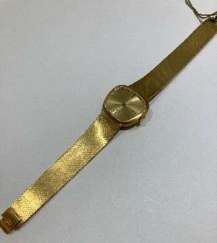 case with French and Swiss assay marks for 18ct gold, quartz movement, tapered gold-coloured dial with baton hour markers in black, the caseback with 9483 B2, 201964, on an integrated mesh bracelet strap with foldover clasp signed Piaget to the interior and marked 750, in box, no papers