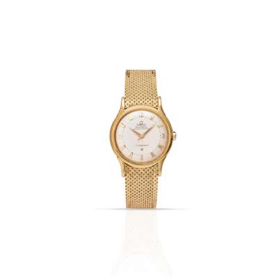 Constellation Automatic Chronometer model, 1970s, case marked 18K to the interior, signed Omega calibre 345 automatic bumper movement, round dial with applied Arabic 12, 3, 6 and 9 and hour markers, sword hands, centre seconds hand, on a later integrated bracelet strap (originally would have been a spring bar strap), with Omega clasp, no box and papers