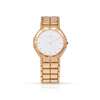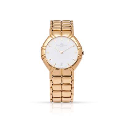 model 15160.9, the case marked 18K, quartz movement, round white dial with applied golf baton hour markers, date aperture at 6, gold pencil hands, ribbed bezel, crown with Baume logo, the caseback with model and serial numbers and personalised inscription dated 1989, on a square link bracelet strap with signed Baume & Mercier clasp, additional links made into cufflinks, no box and papers