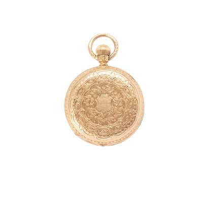 open face, keyless wind, case with full 18ct gokd hallmarks for Birmingham 1894, unsigned 3/4 plate movement, round white enamel dial with Roman numerals in black, outer railroad seconds track in black, case with decorative engraving and central shield motif