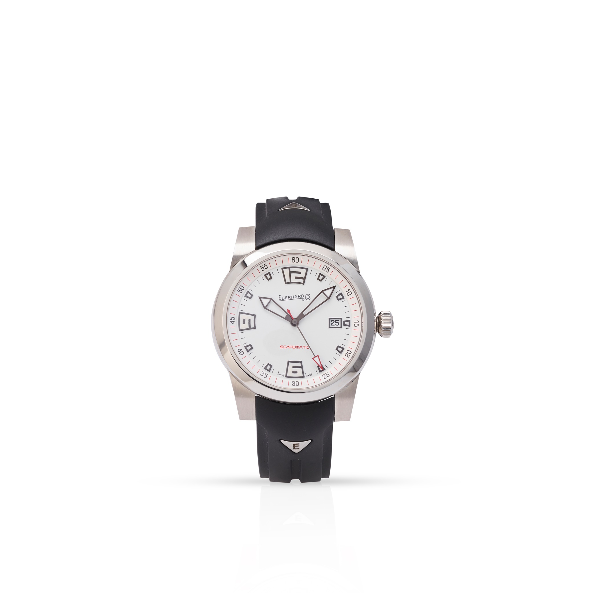 Scafomatic model 41026, stainless steel case, automatic movement, round white dial with Arabic 12, 6 and 9, lume-filled hour markers, date aperture at 3, outer seconds track to raised dial edge, Eberhard logo to the crown, on a signed Eberhard rubber strap with signed clasp, no box and papers
