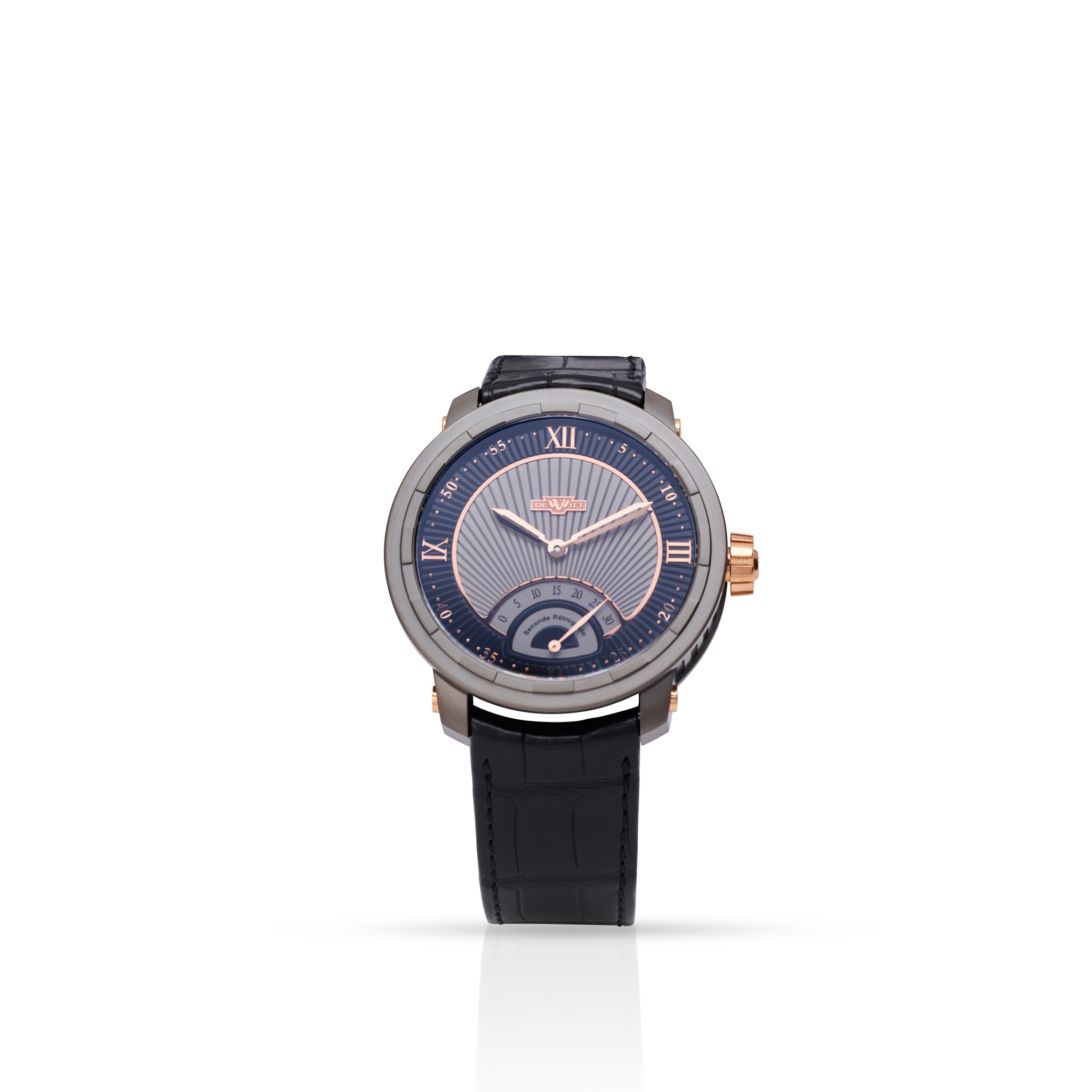 Twenty-8-Eight Second Retrograde model T8.SR.004, titanium case, automatic movement, round dial with outer section in black, inner section grey with sunburst design, rose-coloured Roman numerals, retrograde seconds track at 6, rose-coloured sword hands, crown with DW logo, exhibition caseback with serial number to edge, on a black crocodile strap with signed clasp, in box, with outer box, with guarantee card