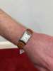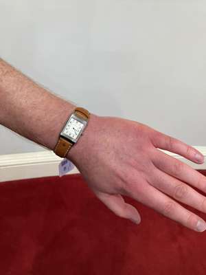 Reverso Classique model 252.8.86, c.2014, stainless steel case, manual wind movement, rectangular silver-coloured dial with Arabic numerals in black, inner railroad seconds track also in black, blued steel sword hands, the casefront with ribbed sections to top and bottom, with model and serial numbers to the caseback, on a signed JLC tan ostrich strap with signed deployant clasp, no box and papers