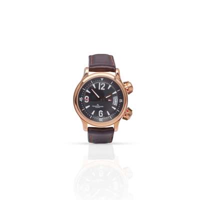 Master Compressor model 148.2.60, rose-coloured case, automatic movement, round black dial with Arabic 12, 6 and 9 in white and wedge hour markers, date aperture at 3, inner bezel with count-up scale in white and red, rose-coloured hands with lume inserts, centre seconds hand with red arrowhead terminal, twin crowns with crown-lock with JLC logo, the caseback with serial and model numbers, on a generic strap, in box, with outer box, no papers