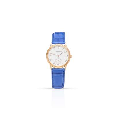 Odysseus model 162.7.81, case with European convention mark for 18ct gold, manual wind movement, round dial with applied gold hour markers and Roman numerals in black, small seconds at 6, crown with JLC logo, on a generic blue strap, no box and papers