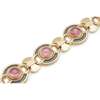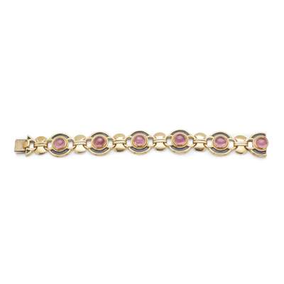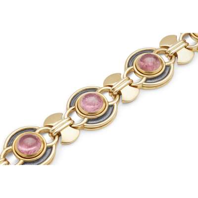 composed of alternating 18ct gold shaped polished links and circular links collet-set with a cabochon pink tourmaline in a blue guilloché enamel border, modelled in 18ct gold, signed