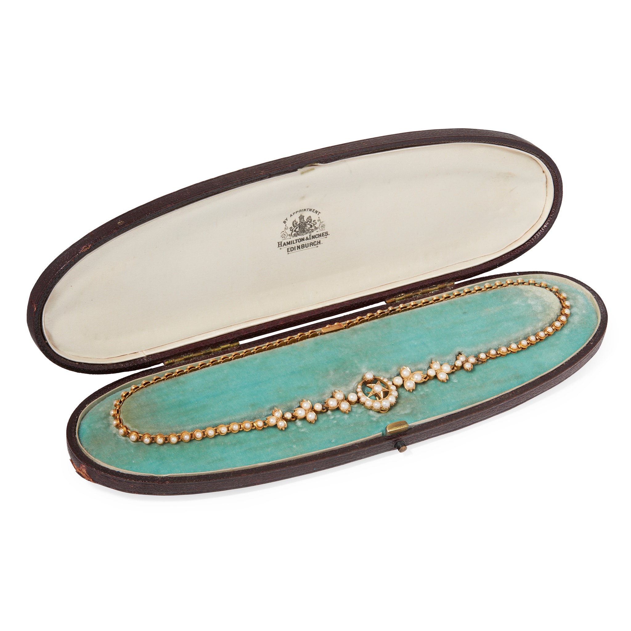 of crescent and floral design, set throughout with small half-pearls, unmarked; in a fitted box for Hamilton & Inches ... Edinburgh