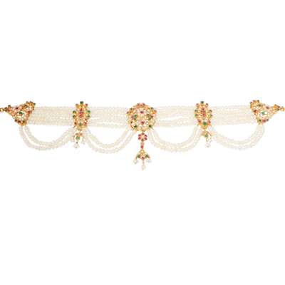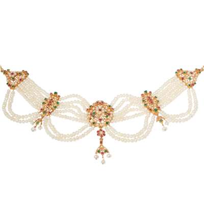 the necklace composed of five rows of freshwater pearls with additional swags, set at intervals with clusters of seed pearls and circular-cut rubies and emeralds, unmarked; the ring of matching design, stamped 22k