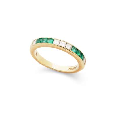 channel-set with square step-cut emeralds and diamonds, mounted in 18ct gold