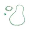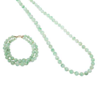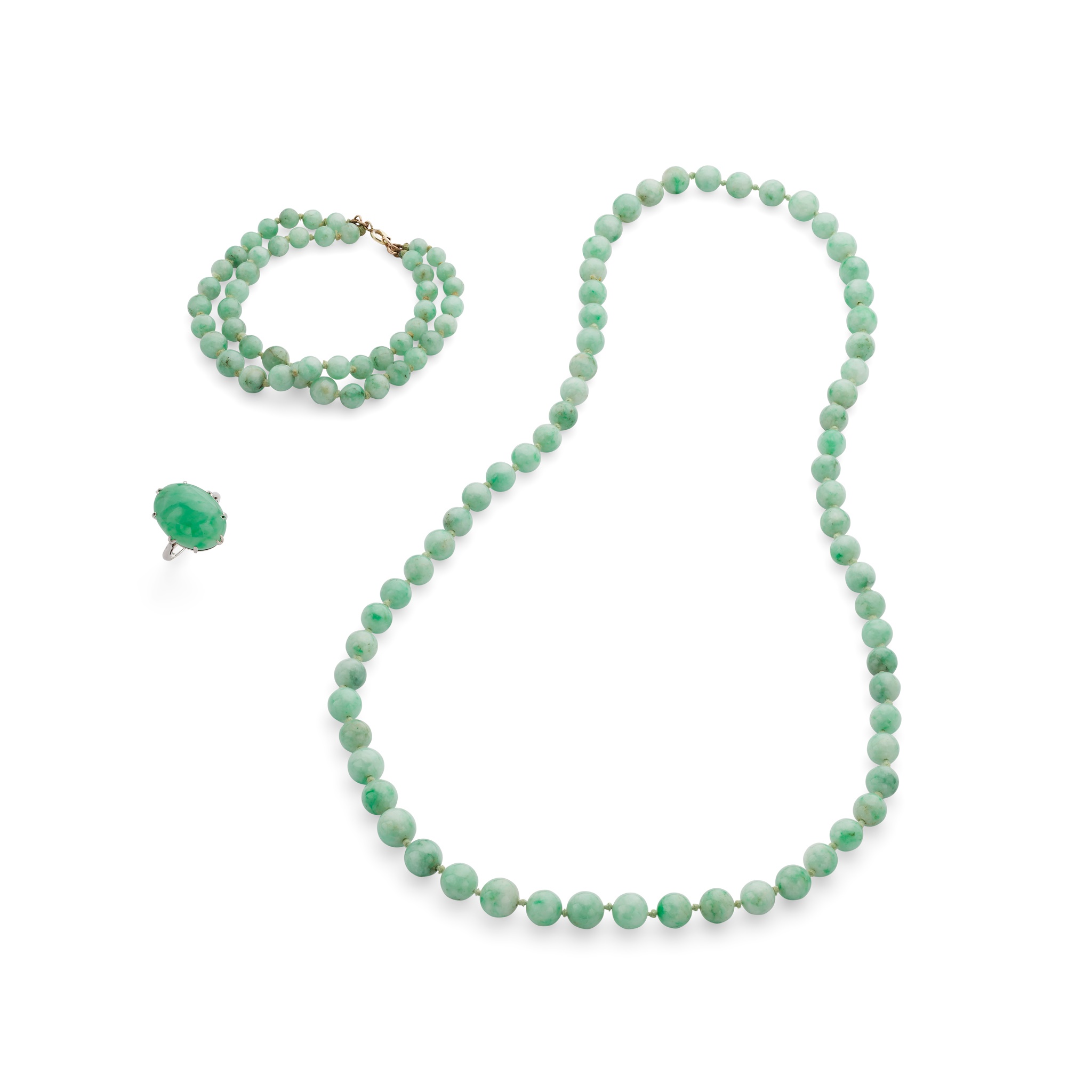 the necklace composed of a single row of jadeite jade beads, the bracelet composed of two rows of graduated jadeite jade beads; together with a cabochon jadeite jade ring, stamped 18ct PLAT