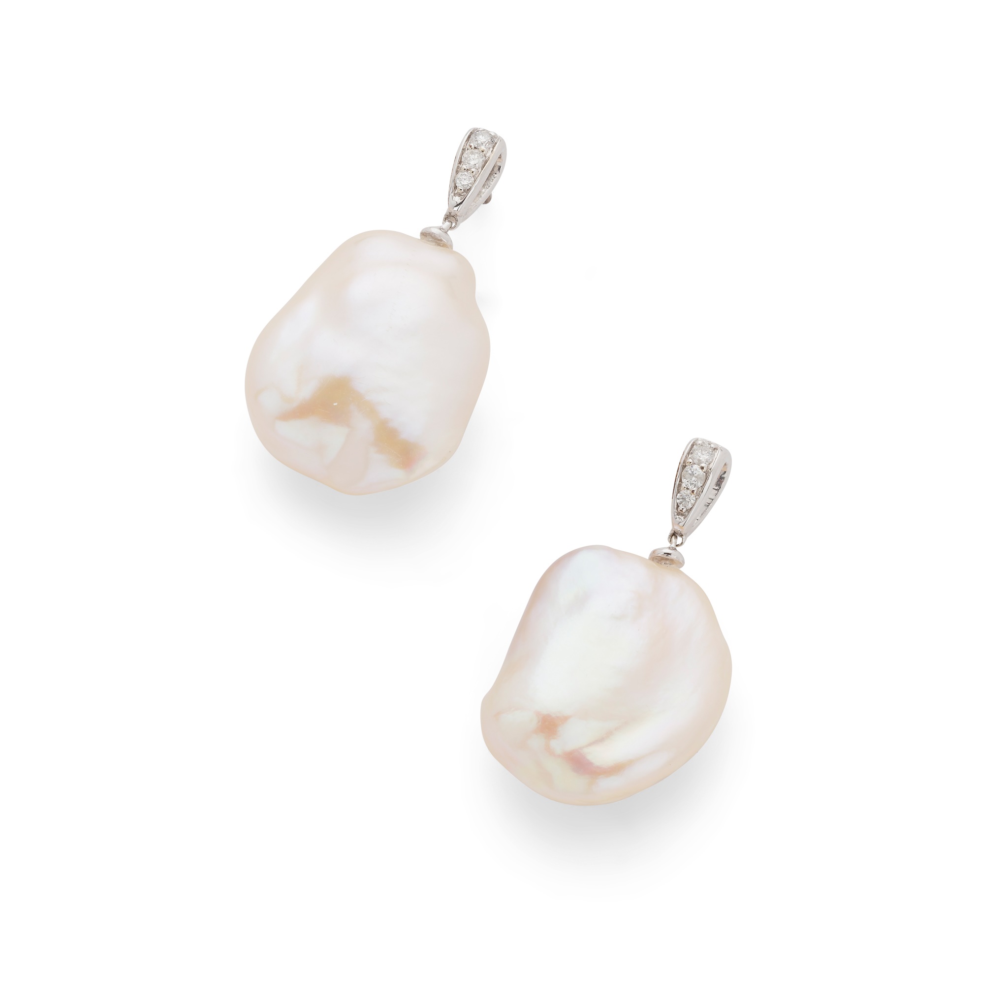 each set with three small round brilliant-cut diamonds, suspending a large baroque cultured pearl, post and butterfly fittings, stamped 375