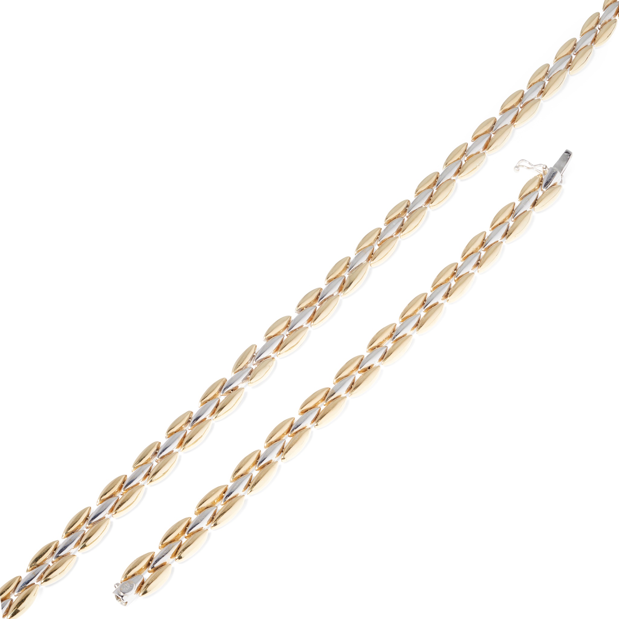 each composed of yellow and white polished lozenge-shaped links, stamped 750