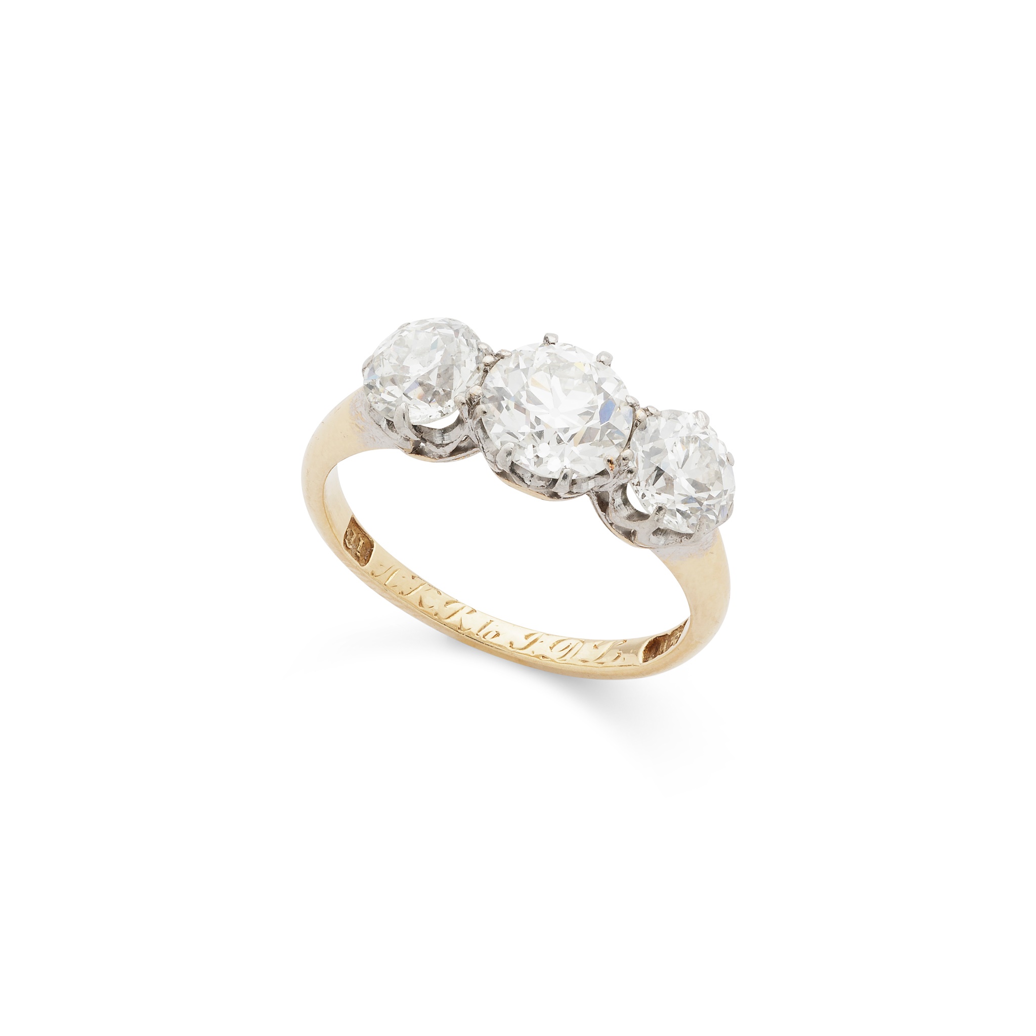 claw-set with three graduated old brilliant-cut diamonds, to an engraved hoop, stamped 18