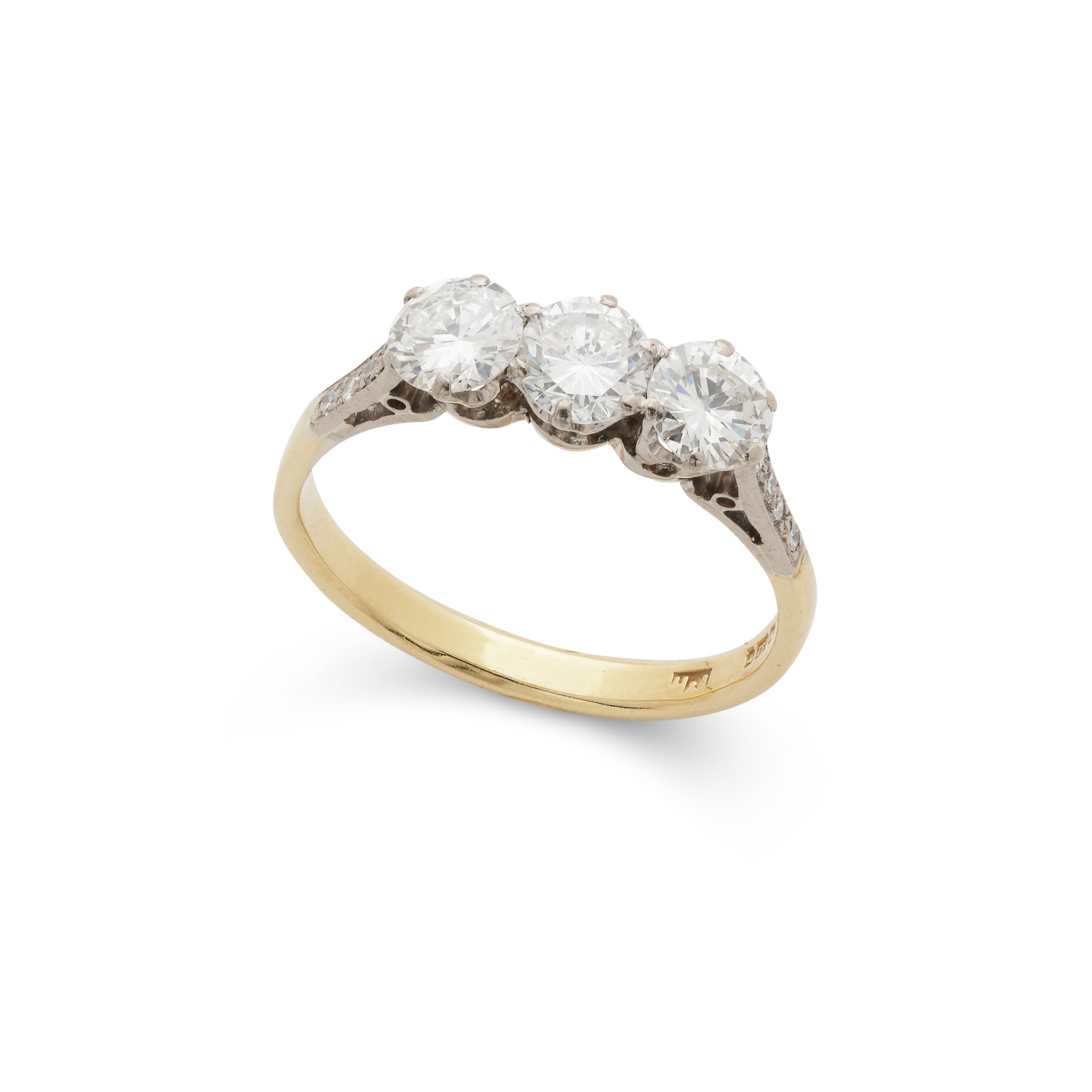 claw-set with three brilliant-cut diamonds, between single-cut diamond shoulders, mounted in 18ct gold
