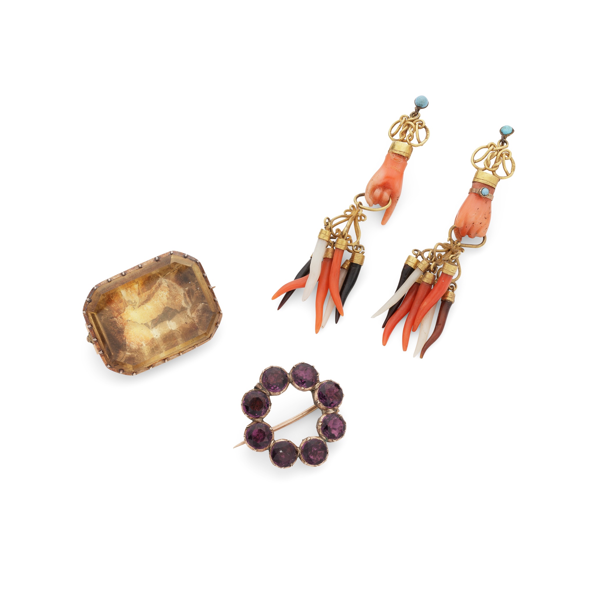 including a pair of coral and turquoise earrings, modelled as a hand clasping a tassel, unmarked; a foil-backed citrine brooch, and a foil-backed amethyst circlet brooch