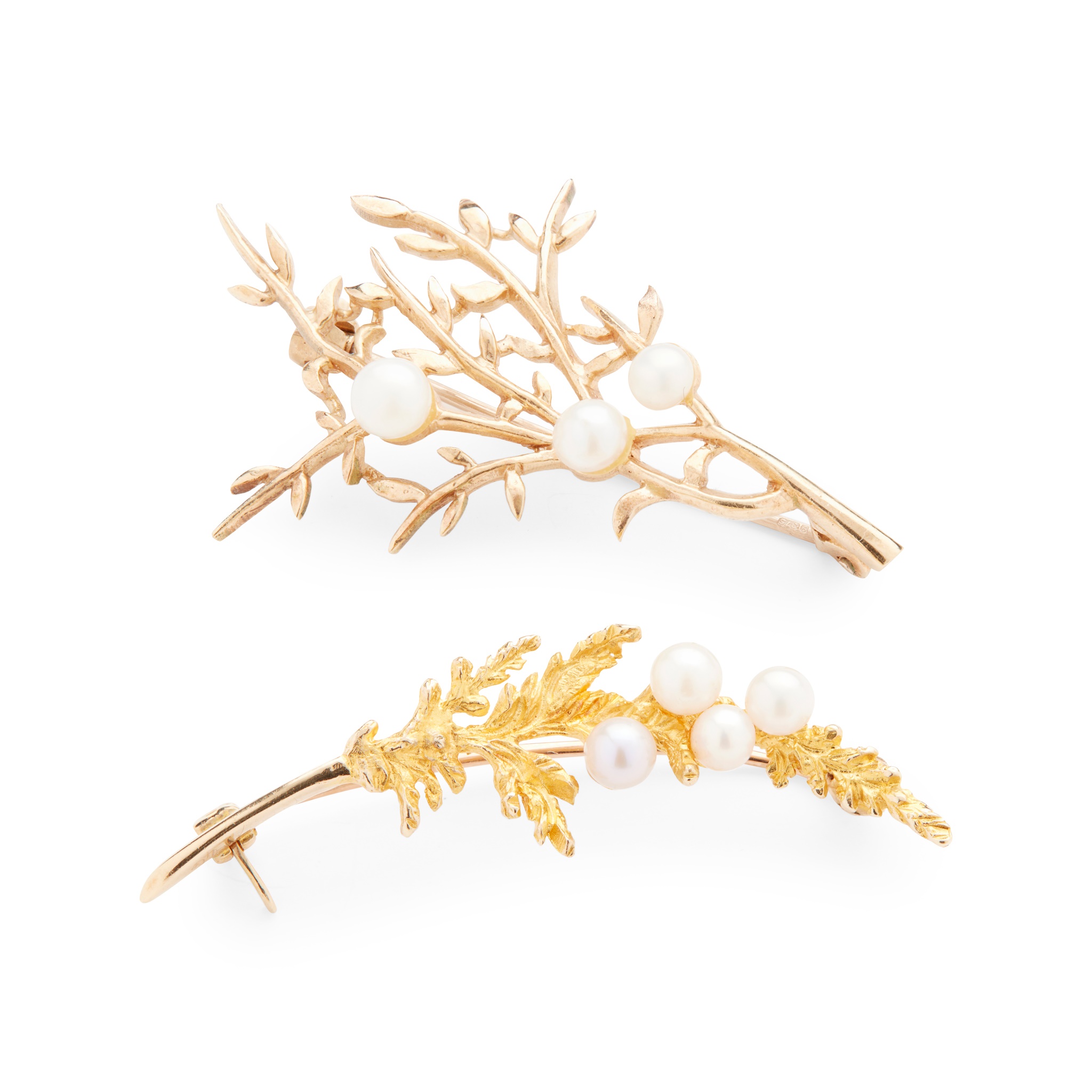 the first modelled as a fern set with four Scottish freshwater pearls, mounted in 9ct gold; the second modelled as a foliate spray and set with three Scottish freshwater pearls, mounted in 9ct gold