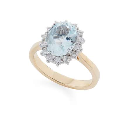 claw-set with an oval-cut aquamarine in a border of brilliant-cut diamonds, mounted in 18ct gold